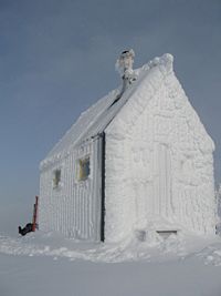 Chimney is prone to collecting rime and being blocked. This is likely to happen whenever the weather conditions dictate. If there's eight inches of ice feathers on the Hut when you arrive, the chimney is likely to be blocked. This occurred in the week up to Nov 21, 2009, when 3m of snow fell in 7 days. In past years the chimney has been cleared by climbing up onto the roof on a ladder and knocking the ice off, but this time it was not possible to get the ladder out from under the Hut, so the stovepipe was disconnected from the stove to allow the inside of the chimney pipe to be scraped out with skis.