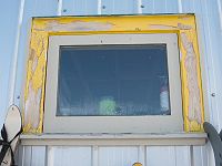 - The window trim that was brought up over the winter was installed around the four previously installed windows and painted white. Could probably use another coat. Paint was left in the hole.